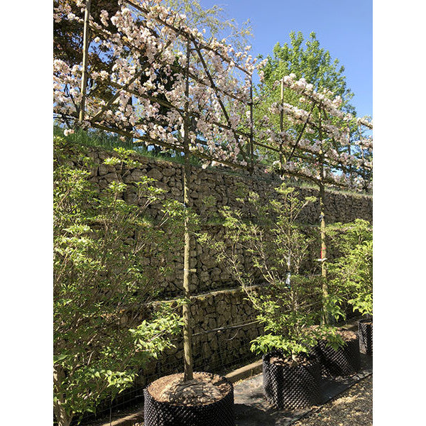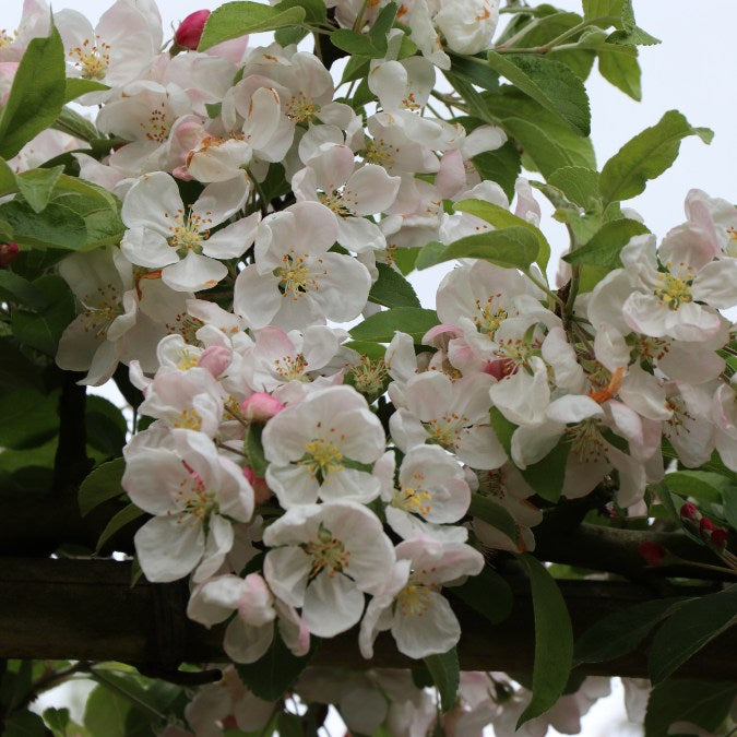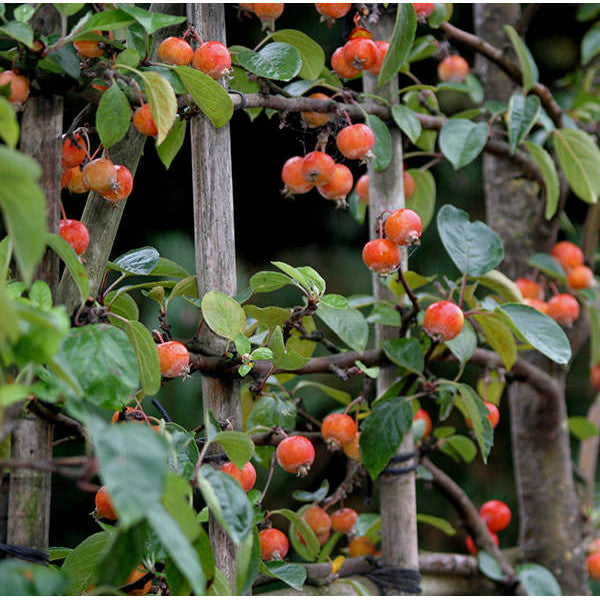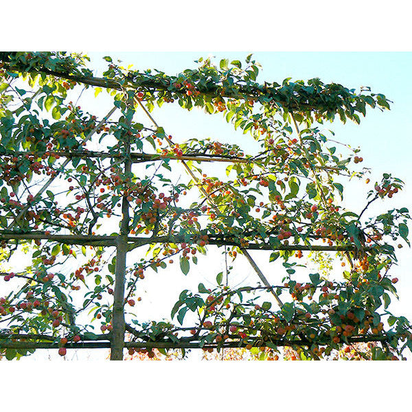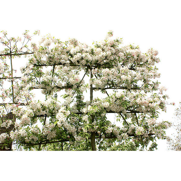 Deciduous. A stunning and unusual variety to be seen in pleached form, this tree produces a wall of white flowers in spring, followed by an eye-catching crop of small, yellow-orange crab apples in autumn.