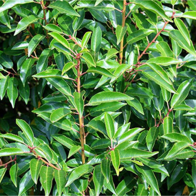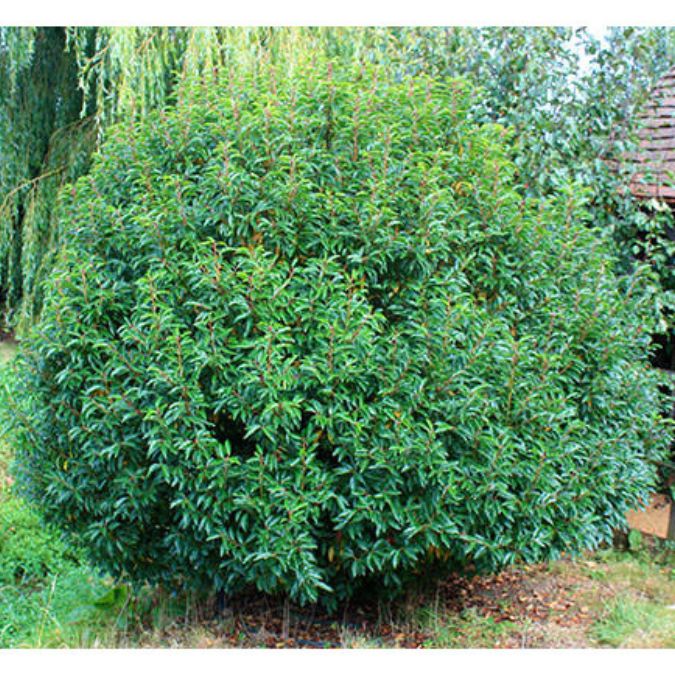 A lovely evergreen with oval dark-green leaves on carmine red stalks; its dense habit making it perfect for creative topiary. Small white, fragrant flowers on long racemes in June often followed by red fruits turning dark glossy purple. Prune twice a year to maintain a crisp shape. Does well on chalk soils. NOTE: Fruit is harmful if eaten. H5