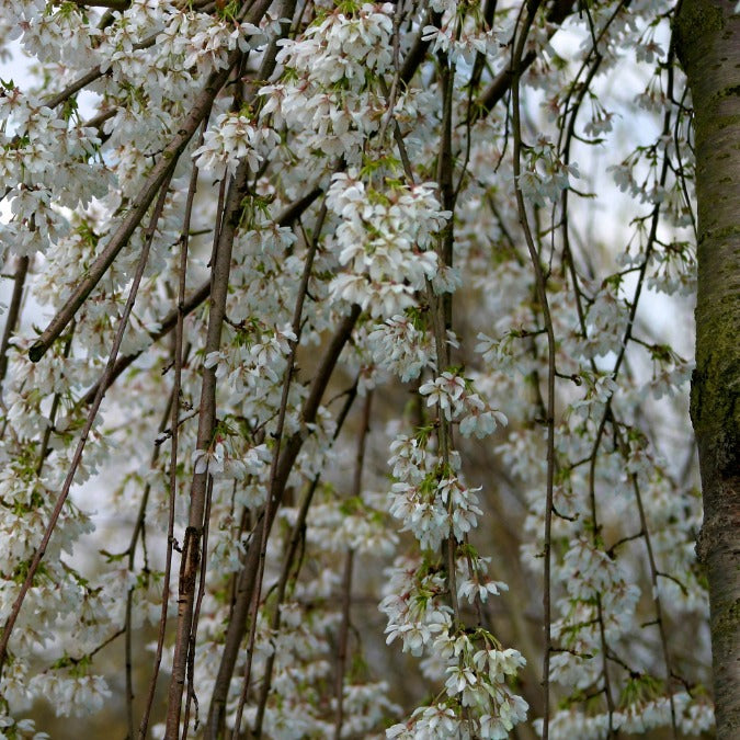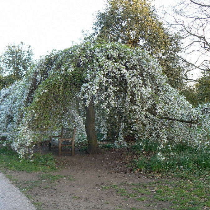 An elegant, weeping tree with long, tortuous branches and long, slender, drooping branchlets, which in late March to early April, turn into snow-white cascades of delicately fragrant blossom. Foliage emerges beautifully bronze, maturing to dark-green in summer then fiery red in autumn. Tolerant of polution and wide range of soils except wet ones and chalk. H6