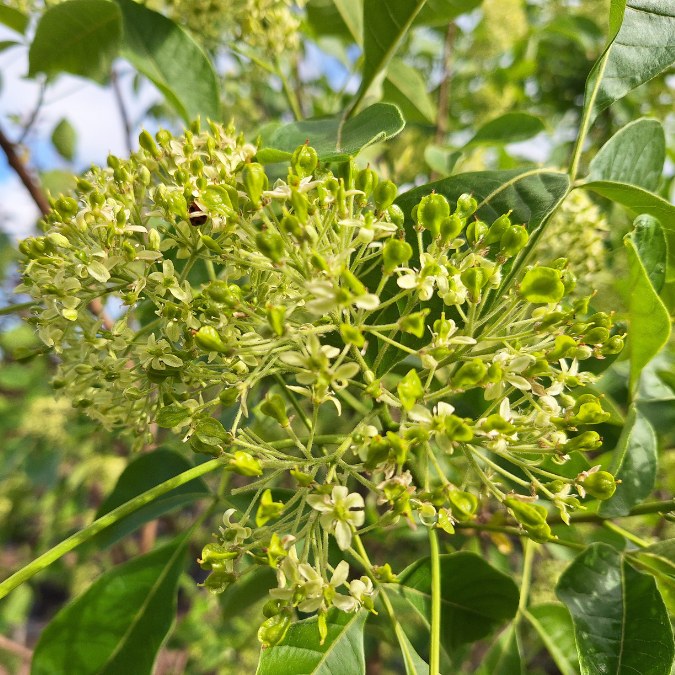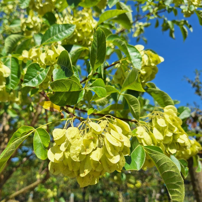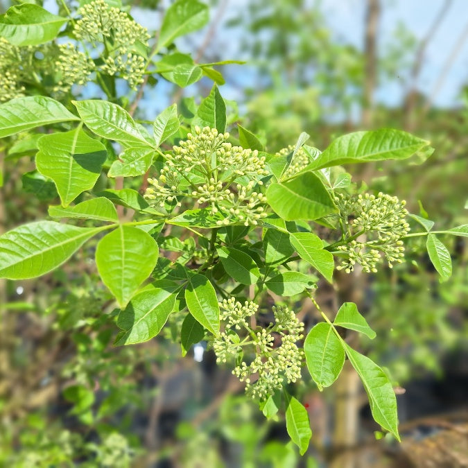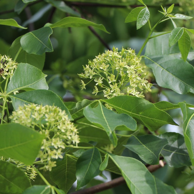 An attractive North American native developing a broadly-round crown with arching branches and glossy dark-green leaves, each with a handsome constrasting pale-green midrib and petiole. Inconspicuous flowers are followed by decorative clusters of pale-green, winged fruit. All parts are very aromatic. Great in all well-drained soils. H6